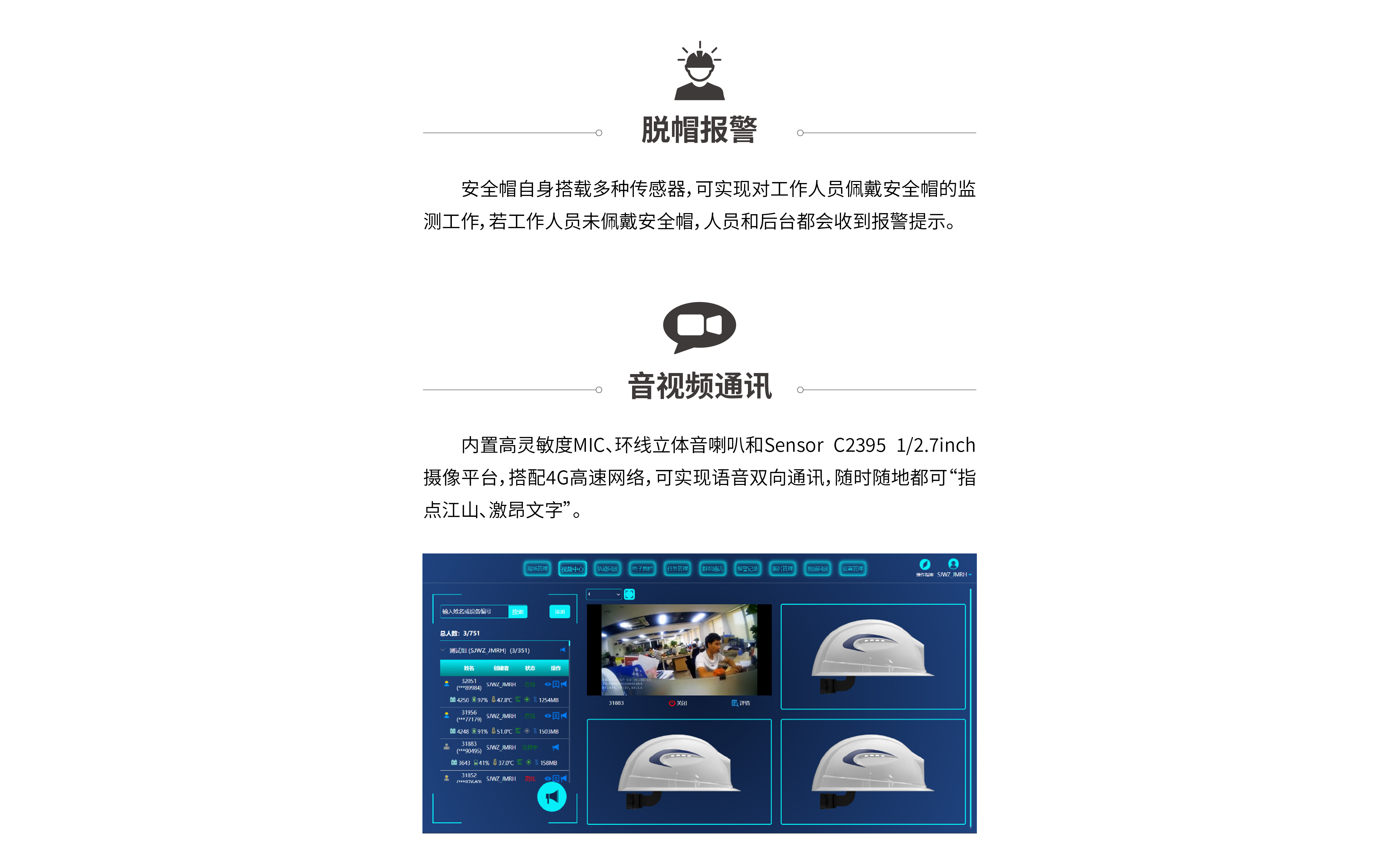 南方智能定位安全帽,一款匯聚防護(hù)、定位、監(jiān)控于一體的智能化產(chǎn)品。強(qiáng)大的工業(yè)級(jí)高清攝像頭與4G高速網(wǎng)絡(luò)結(jié)合,搭配專(zhuān)業(yè)管理平臺(tái)可實(shí)現(xiàn)錄像、遠(yuǎn)程指導(dǎo)、實(shí)時(shí)視頻監(jiān)控等多種功能。根據(jù)不同場(chǎng)景需求可額外選配不同傳感器,實(shí)現(xiàn)脫帽報(bào)警、跌落報(bào)警、近電感應(yīng)、撞擊報(bào)警等更多指定擴(kuò)展功能。
