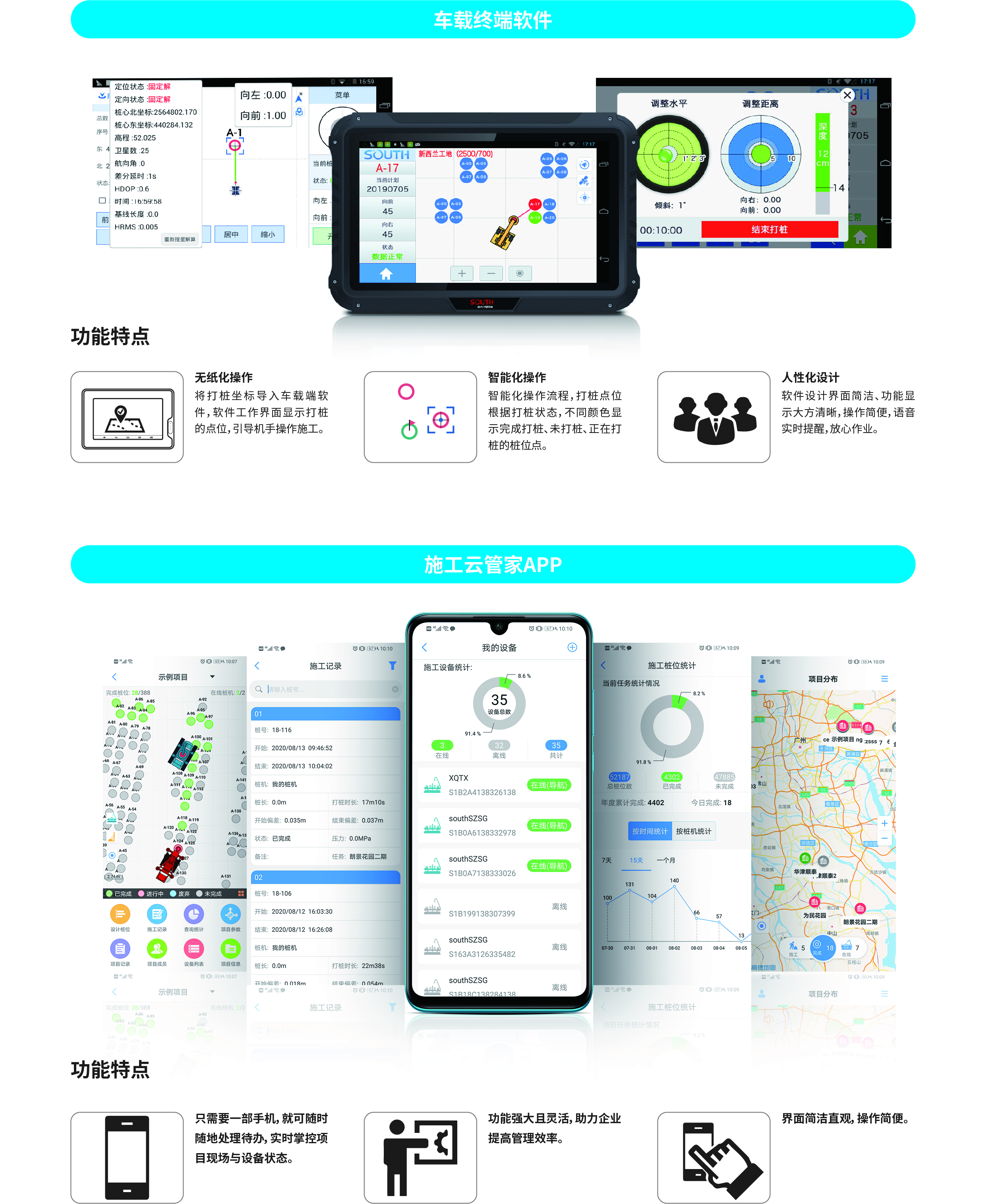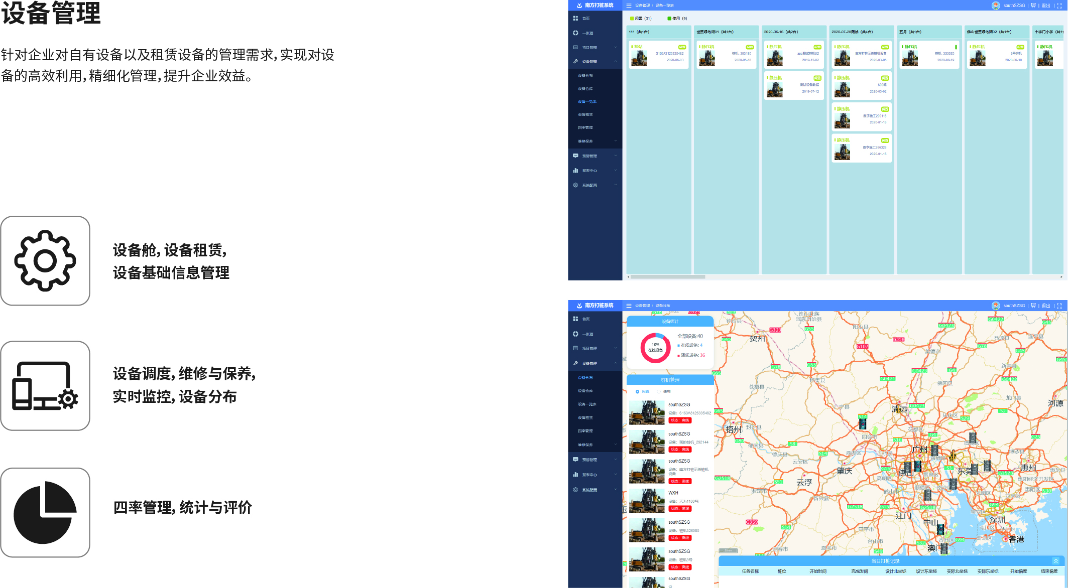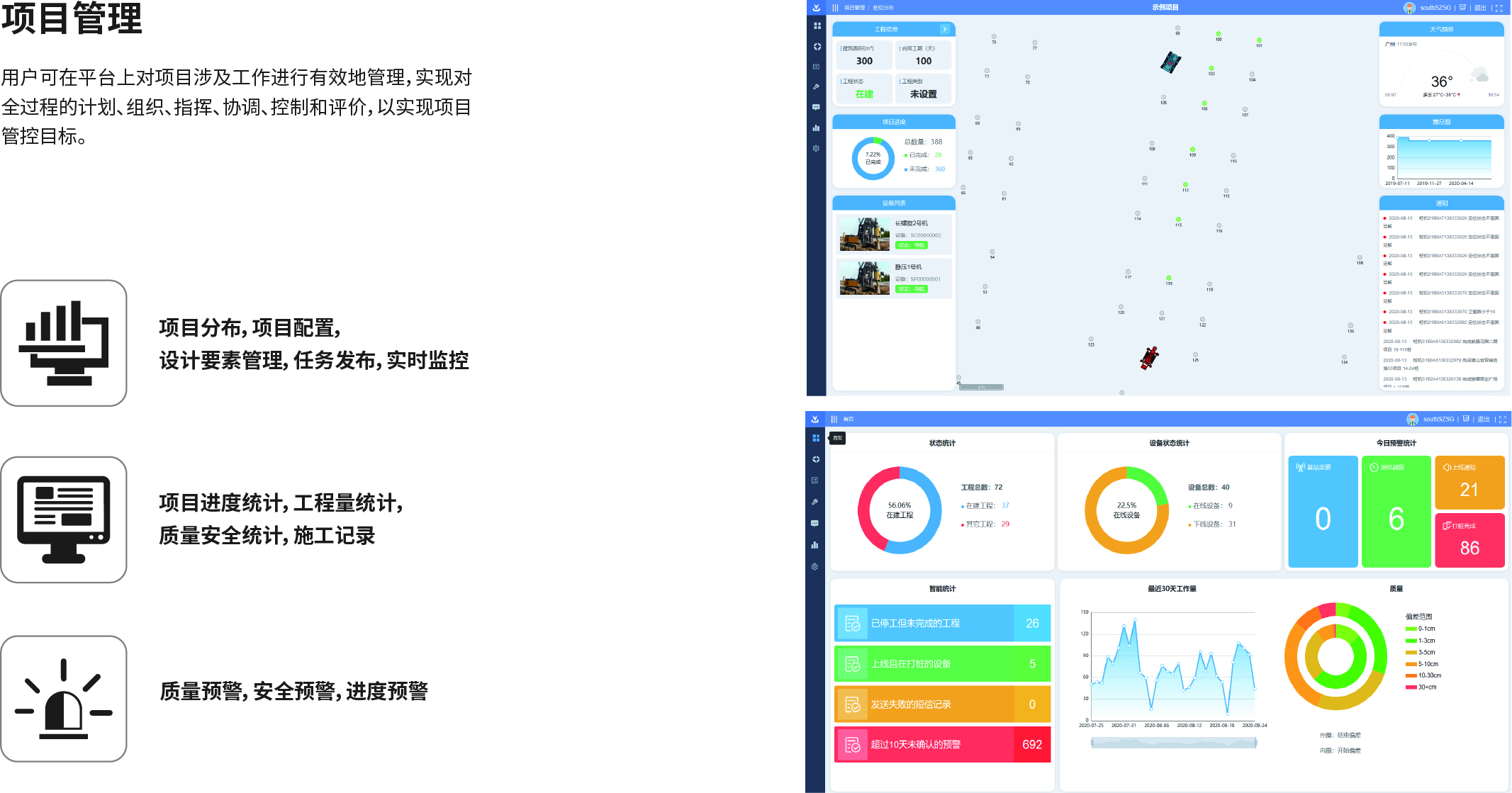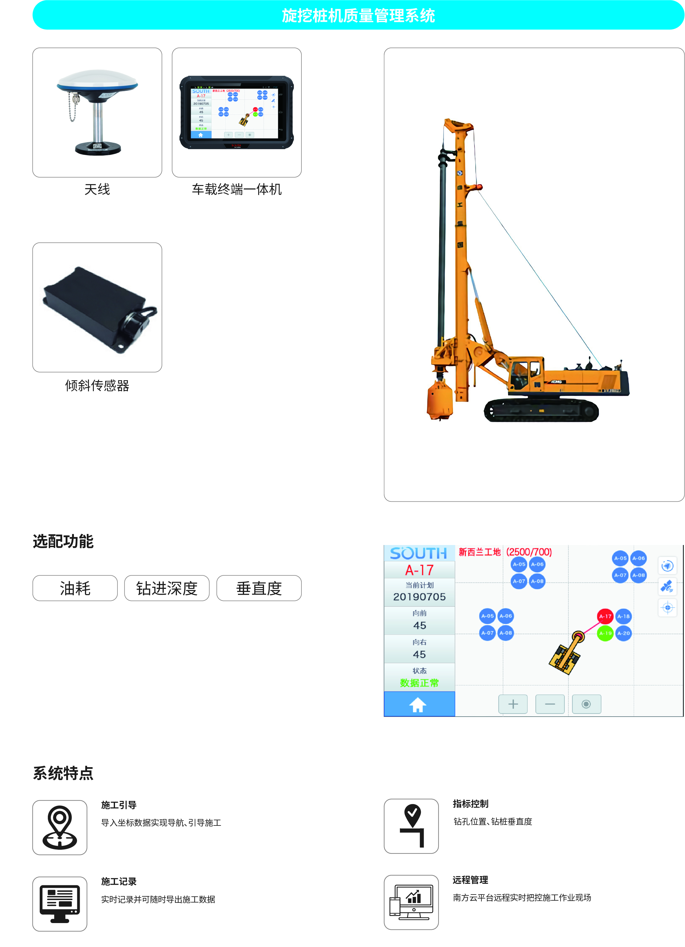 南方NDCS數(shù)字化施工云平臺(tái)是依托物聯(lián)網(wǎng)、互聯(lián)網(wǎng)建立的大數(shù)據(jù)管理平臺(tái)。平臺(tái)以“互聯(lián)網(wǎng)+”為理念,實(shí)現(xiàn)了地基處理施工全過(guò)程信息化、數(shù)字化、智能化和可視化,為靜壓樁機(jī)、液壓錘、柴油錘、長(zhǎng)螺旋、旋挖機(jī)、多軸樁機(jī)等多類(lèi)基礎(chǔ)機(jī)械在施工質(zhì)量管理方面提供整套優(yōu)質(zhì)的綜合解決辦法。平臺(tái)可實(shí)現(xiàn)對(duì)施工進(jìn)度、施工質(zhì)量、施工設(shè)備的信息化管理以及智能統(tǒng)計(jì)、智能預(yù)警、智能化施工等功能,并配備“施工云管家”APP端,實(shí)現(xiàn)遠(yuǎn)程化項(xiàng)目多設(shè)備管理,讓用戶(hù)能實(shí)時(shí)遠(yuǎn)程把控現(xiàn)場(chǎng)施工進(jìn)度、質(zhì)量,高效管理調(diào)度自有及租賃設(shè)備,有效加強(qiáng)項(xiàng)目風(fēng)險(xiǎn)管控與目標(biāo)執(zhí)行。