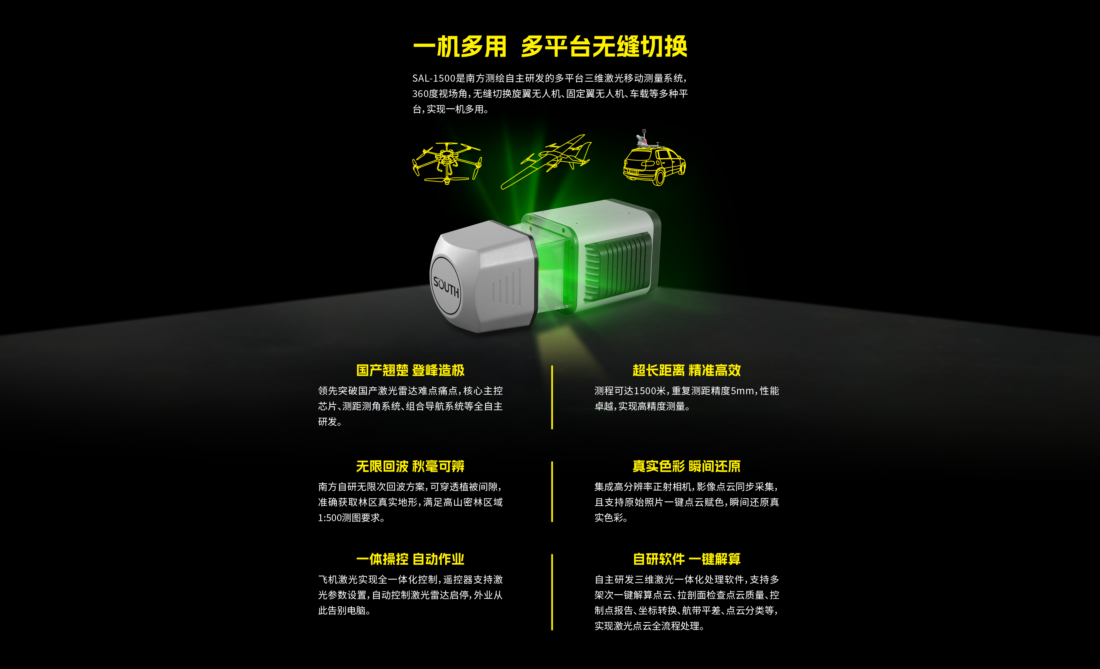 SAL-1500是南方測繪自主研發(fā)的多平臺(tái)三維激光移動(dòng)測量系統(tǒng),360度視場角,無縫切換旋翼無人機(jī)、固定翼無人機(jī)、車載等多種平臺(tái),實(shí)現(xiàn)一機(jī)多用。